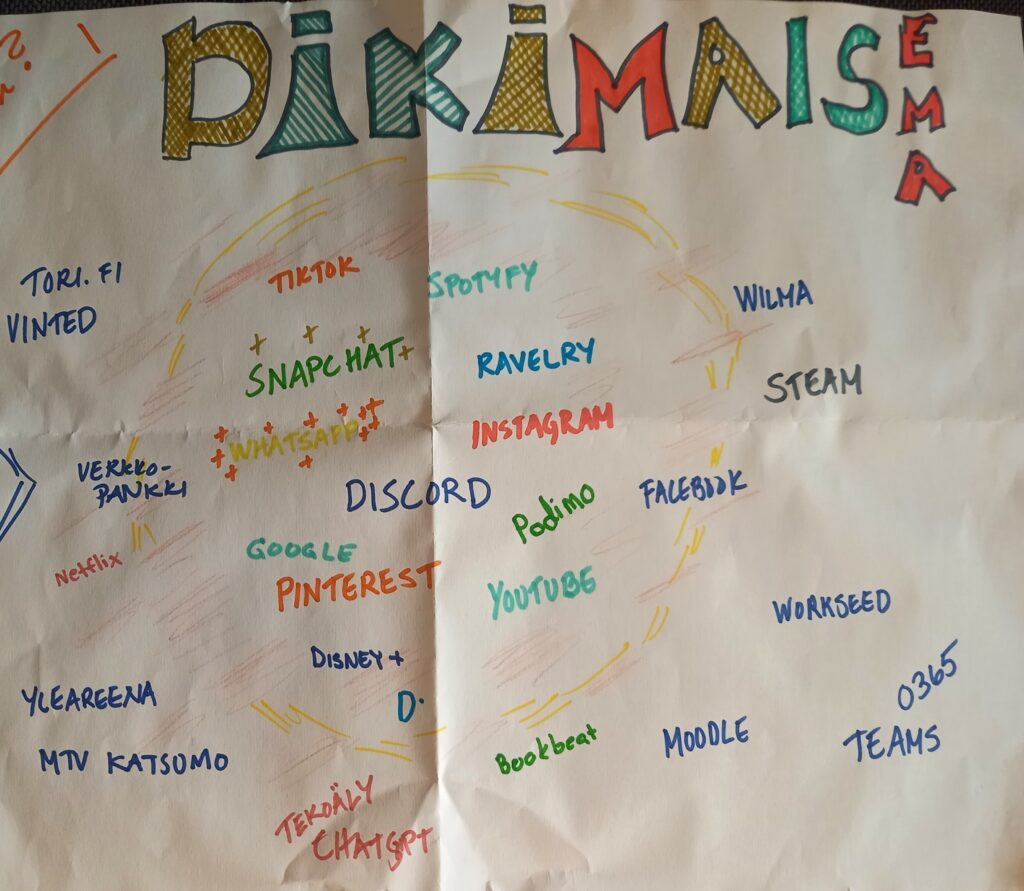 Opiskelijat ovat samanmielisiä siitä, että M365, Moodle ja Wilma sijoittuvat kauas ulkokehälle. Näitä käytetään harvoin tai pakosta. Digimaiseman keskiössä ovat Snapchat, TikTok, Discord, Whatsapp, Podimo, Instagram, Pinterest, Google, YouTube, Disney+ Nämä ovat sovelluksia, joita he käyttävät työpaikoilla nuorten ohjauksissa. Kanavat, joita oppilaitoksen digistrategia ei edes huomioi.