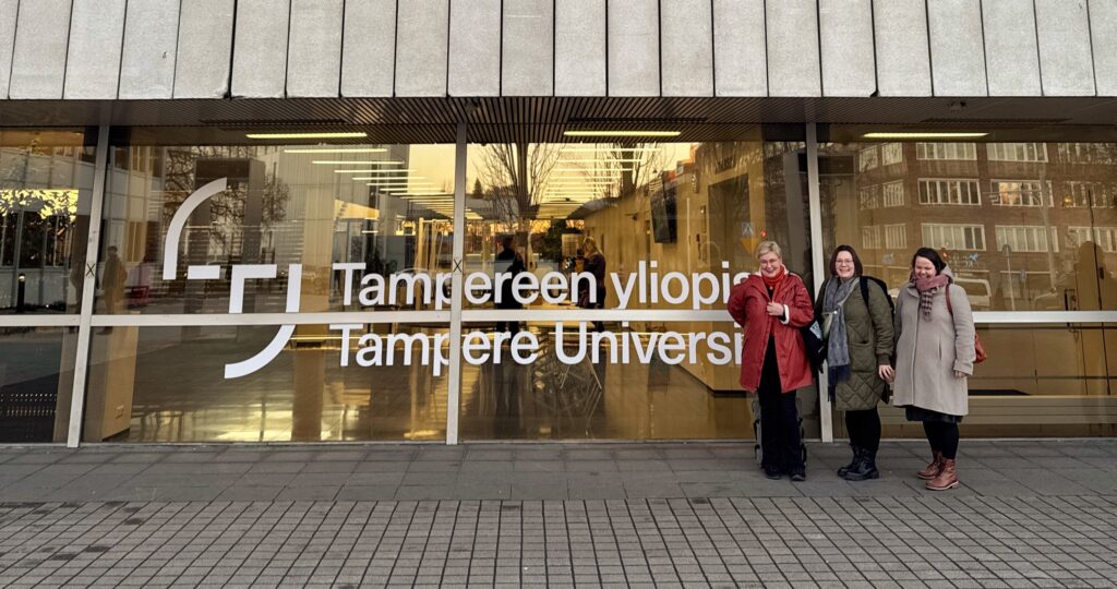 Nuorisotutkimuspäivät järjestettiin Tampereen yliopistolla. Yliopiston logon edessä Nuorisotutkimusseuran tutkimusjohtaja Eila Kauppinen sekä valtion nuorisoneuvoston sihteeristön erityisasiantuntijat Kirsi Sulaoja ja Eija Kauniskangas.